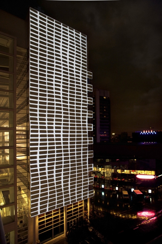 De gerasterde façades vormden het vertrekpunt voor reusachtige projecties. Uit het grid van witte tegels begonnen nieuwe vormen te groeien met grillige, organische eigenschappen. Delen van de gevels leken te barsten of los te weken, om vervolgens weg te vloeien. Het steriele aspect van de architectuur werd zo getrotseerd en langzaam maar zeker overwoekerd.